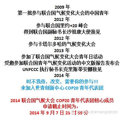 在2014联合国气候变化大会开幕之际,世青创新中心推出联合国气候变化大会青年项目,选拔关注公益领域的优秀青年参与秘鲁利马气候大会,旨在从青年视角观察社会,号召更多中国青年关注全球气候变化领域,促进中外青年关于全球气候变化的对话。我们将通过招募核心成员团队的方式,吸引有志青年参与到高端的国际会议中,同时推动他们用实际行动来产生社会影响力。