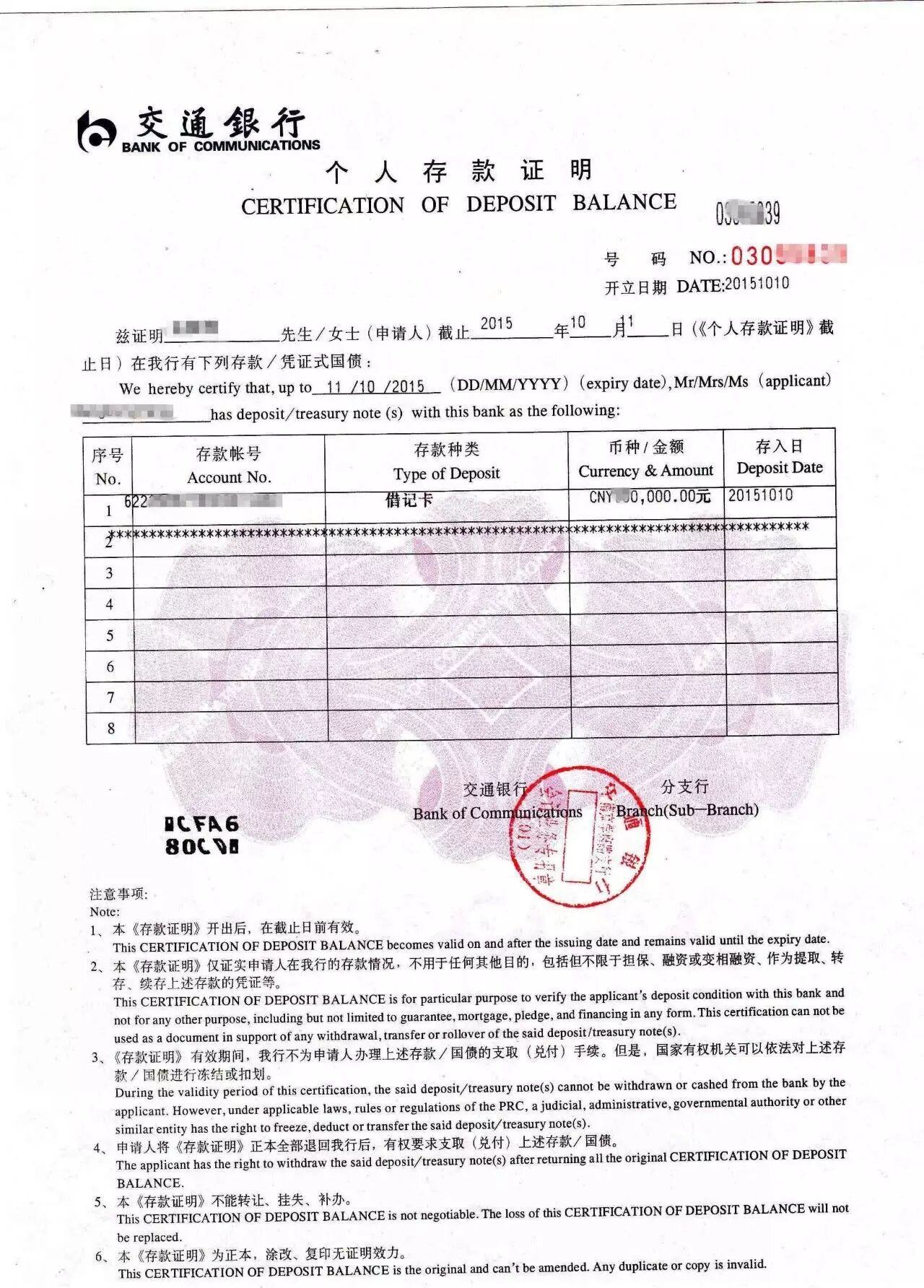 (3)明年6月份申请签证时,需要准备一笔资金,大概100-150万,冻结10天左右。例如:面签时间是2016年5月26号,请于5月20号开存款证明,冻结至5月30号之后(前提是要求冻结;依据相应银行的要求,存期1或3个月,有到期日)。开2份,备用1份。如果不够,需要补充父母收入证明。过了冻结期之后,存款证明自动解冻;为了方便资金灵活,若需要提前解冻,面签后,把2份存款证明全部交还给银行,要求解冻即可。
