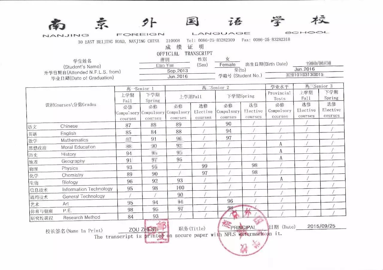 在申请过程中,需要/学生家长帮助准备的一个重要材料就是学校官方成绩单。需要在学校9月份开学之后,到相应的初中和高中开具9-11年级的中英文对照的成绩单。美国本科申请要求提供9-12年级的成绩。按照美国的学制,我们的初三是美国的9年级,高一10年级,高二11年级,高三12年级。
